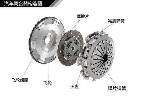 我們能看到離合器的位置就是在發(fā)動(dòng)機(jī)和變速器這兩者之間的,簡(jiǎn)單的說(shuō)就是離合器的一端是連著發(fā)動(dòng)機(jī)的,另外一端是連著變速器的。它的組成部分分為:主動(dòng)部分(飛輪、離合器蓋等)、從動(dòng)部分(摩擦片)、壓緊機(jī)構(gòu)(膜片彈簧)和操縱機(jī)構(gòu)(離合器踏板)。如圖
